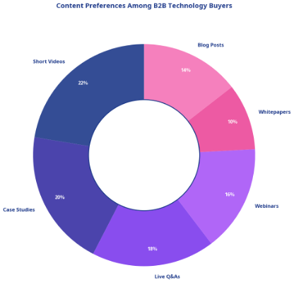 Chart 2: Donut chart showing the dominance of short videos (65%) and case studies (58%) in content preferences.