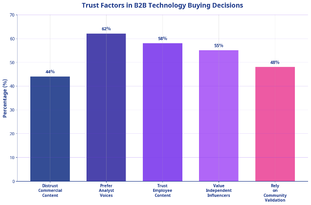 - A trust deficit exists: 44% distrust content that feels too “salesy” or AI-generated; independent influencers and employees are rated more credible than CEOs.