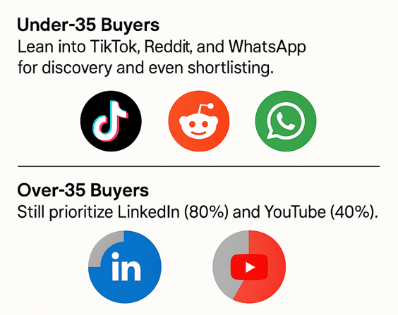 - A clear generational split: LinkedIn + YouTube dominate for over-35s; TikTok, Reddit, and WhatsApp are the go-to platforms for under-35 buyers.